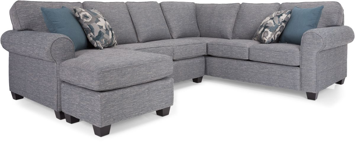 This transitional yet traditional style sectional features semi attached back with rolled arms and an abundance of toss pillows-resulting in a versatile foundation for your seating area. Hand-built by our dedicated upholster artisans in North America.Read More