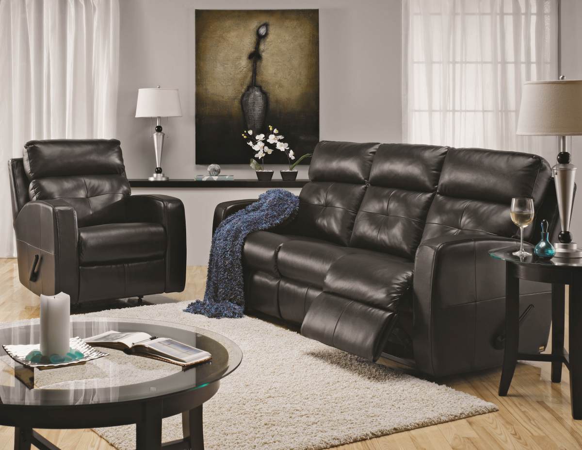 The Chloe Black Reclining Sofa features track arms, a tufted pillow back and 2 recliners on each side. In Stock Version includes Power Reclining. In Sock Version is Genuine Leather Seating.Read More