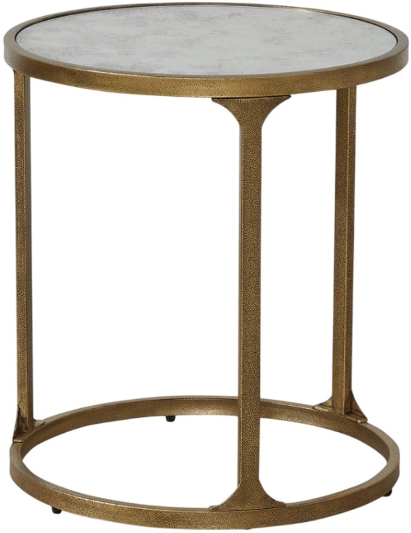 This end table blends a traditional feel with contemporary design cues. Antiqued gold texturing on the frame has the look of timeworn, hand-forged metal. A tempered glass top with a faux marble finish provides a refined contrast. Chic when hosting decor, a lamp or holding entertainment essentials.Read More