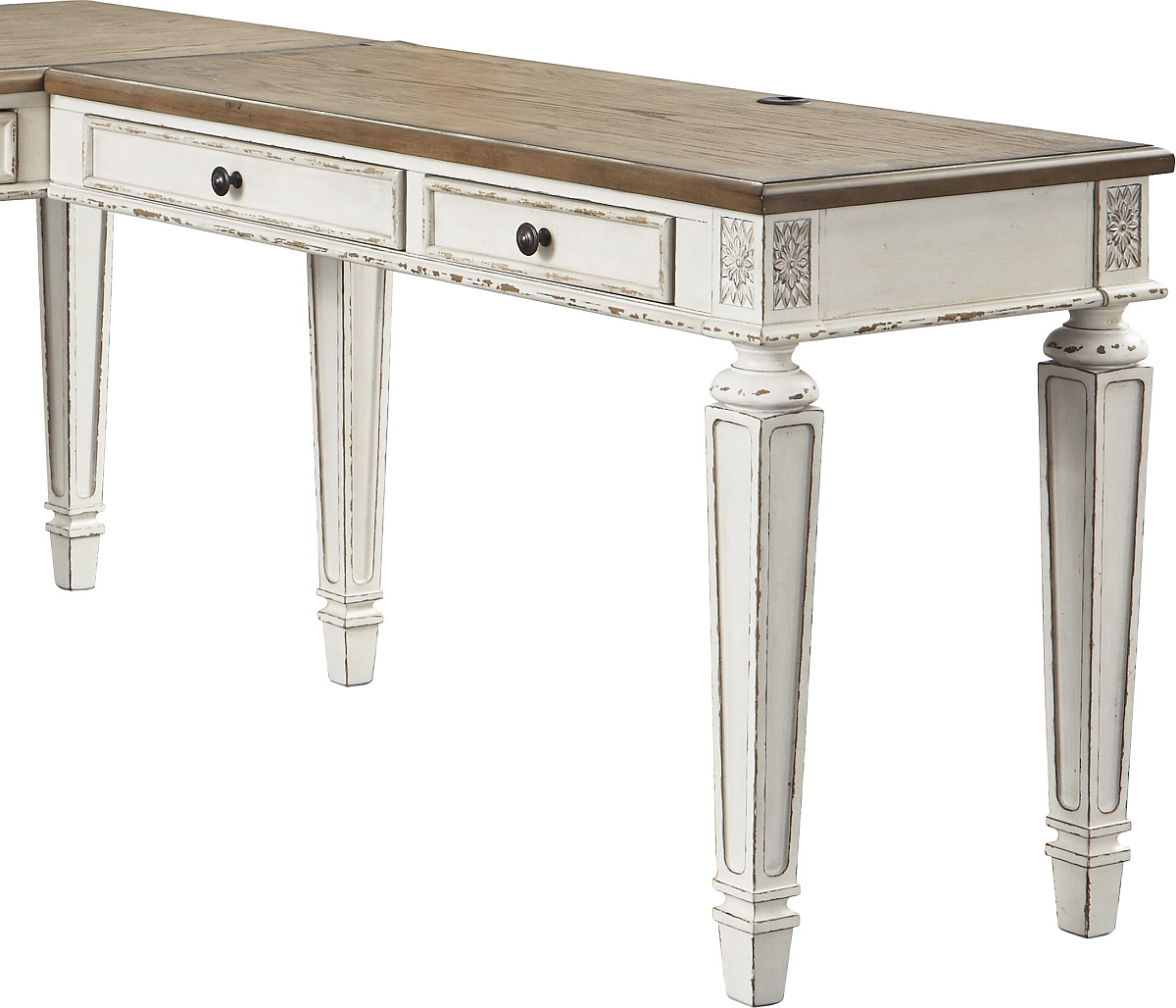 Elevating the art of traditional cottage styling, the Realyn desk return is your heavenly home office realized. Antiqued two-tone aesthetic blends a chipped white with a distressed wood tone top for added charm. Framed drawer fronts, decorative corbels and elegantly turned and tapered legs add refinement, while dark bronze-tone knobs lend a classic touch. Assembly required for this product.Read More
