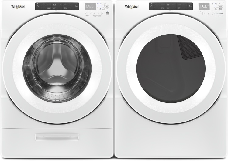 Whirlpool® White laundry pair with a 5.0 cu. ft. capacity front load washer and a 7.4 cu. ft. capacity front load gas dryer.Read More
